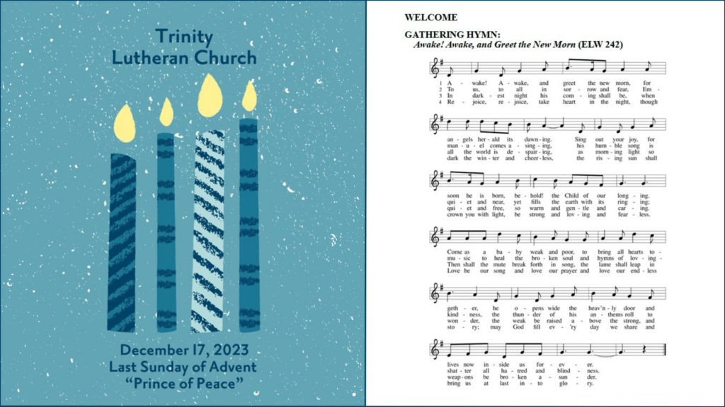 Online Worship Worship Services Sunday Worship – December 17, 2023 – Fourth Advent by telcoffice|Published December 11, 2023 Online link: Bulletin: