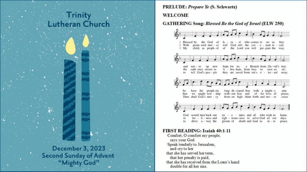 Online Worship Worship Services Sunday Worship – December 3, 2023 – Second Advent by telcoffice|Published November 27, 2023 Online link: Bulletin: